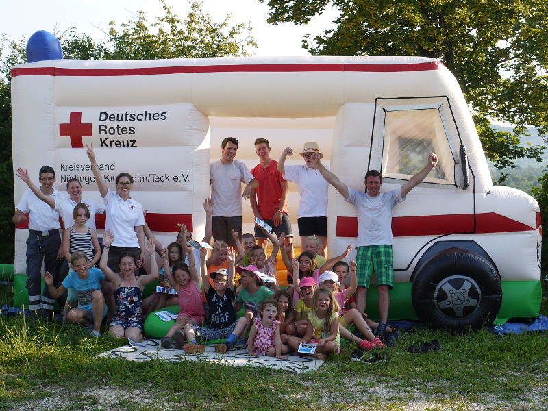Um 10.00 Uhr am Morgen und bei bestem Sommerwetter trafen sich 20 Jungs und Mädels mit den eifrigen Helfern des JRK, um einen tollen Tag beim JRK Linsenhofen zu erleben.