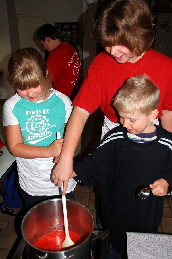 Abschließend wurden für die Ausbildung rund 40kg Früchte und Fruchtsaft –Himbeeren, Erdbeeren, Johannisbeeren, Brombeeren, Stachelbeeren, Zwetschgen, Rhabarber, Apfelsaft, Quittensaft, Johannisbeersaft-, 17kg Gelierzucker 1:1 und 14kg Gelierzucker 2:1 verarbeitet. Eine Masse die ca. 180 Gläser füllt.