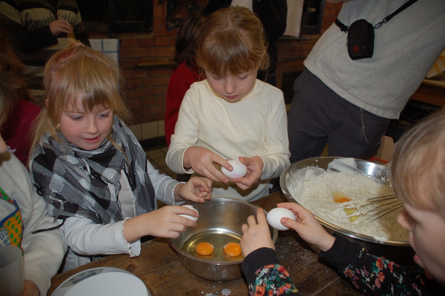 In zwei Gruppen aufgeteilt, begann Gruppe 1 mit der Herstellung eines Teiges aus Weißmehl, Butter, Milch, Wasser, Salz und Hefe. Aus diesem Teig wurden kleine Flammkuchen zubereitet, die jeder Teilnehmer individuell mit Speck, Lauchzwiebel, Zwiebel und Kräutern belegen konnte. Dazu kamen noch Zwiebel-, Rahm-, und Salzkuchen.