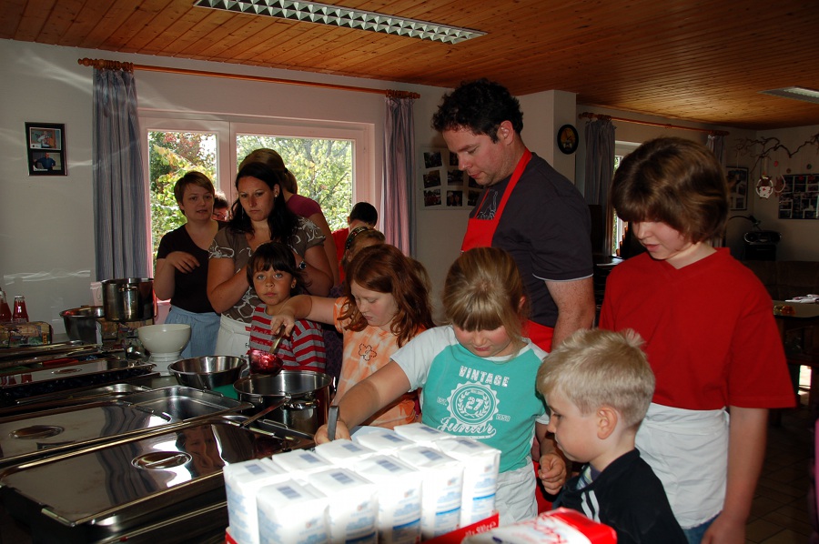Bereits Tage zuvor waren die Gsälzbären rund um den Obergsälzbär aktiv und bereiteten den letzten Abschnitt zum Erreichen des Gsälzbären Daseins vor. Die Ernte dieses Jahr war reichlich, insgesamt 40 Kilo Früchte und Fruchtsaft lagerten in der Tiefkühltruhe, die nun zum auftauen kamen. Dazu noch frische Zwetschgen. Und dann waren sie da, die Gsälzbärla, voller Tatendrang teilten sie sich in Kleingruppen auf die 6 Kochstellen auf, jede Gruppe betreute ein Gsälzbär. Die Technik ist simpel: Früchte holen, abwiegen und mit Gelierzucker vermischen. Die Qual der Wahl, welche Früchte als nächstes kommen und welche eine gute Mischung ergeben, war oft schwieriger als die Zubereitung selbst. Rezepte sind streng geheim und werden nur von den Obergsälzbären weitergegeben. Einige sind anfänglich beim richtigen Mischungsverhältnis des Gelierzuckers ins Schleudern gekommen. Richtig ist ein Teil Früchte und ein Teil Zucker bei Gelierzucker 1:1 oder zwei Teile Früchte und ein Teil Zucker bei Gelierzucker 2:1. Anschließendes Aufkochen tötet Bakterien und Keime, sorgt für die komplette Lösung und Verbindung des Zuckers mit der Fruchtmasse und macht das Gsälz, in frisch gespülte Gläser abgefüllt, haltbar. Das Geliermittel Pektin sorgt dafür, dass die Fruchtmasse bei Erkalten fest wird. So konnte sich jeder, nun Gsälzbär, nach Herzenslust austoben, seiner Fantasie freien Lauf lassen und wer weiß, vielleicht neue Rezepte finden, die er als angehender Obergsälzbär an seine Sprösslinge weitergeben kann. Eine Abfrage des theoretischen Wissens in Form eines Quiz rundete die Ausbildung ab. Glücklich können wir auf 16 Gsälzbären aufsehen, die die Tradition und Rituale des Gsälzens weiterführen.